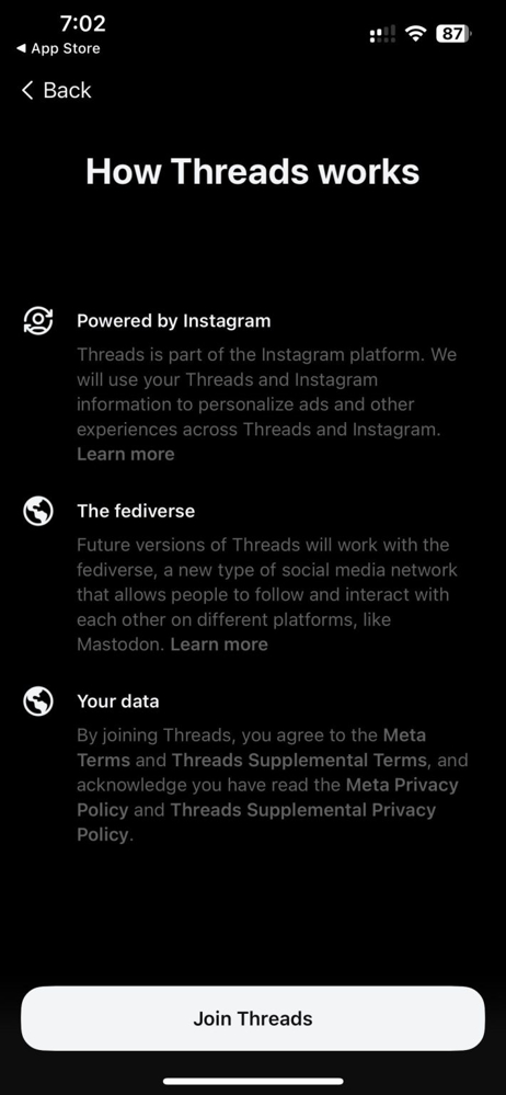 اگر اینستاگرام روی گوشی شما نصب باشد و وارد تردز شوید، در ابتدا با این صفحه مواجه میشوید.